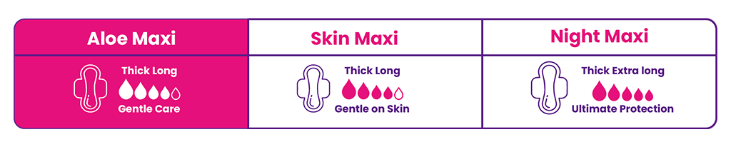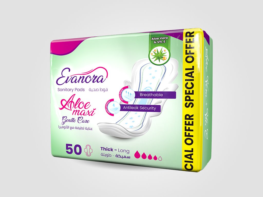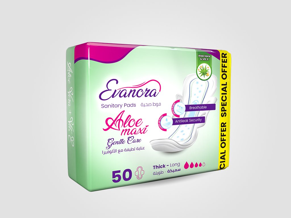 Evanora Aloe-Maxi sanitary pads offer ultimate comfort and reliable protection with a thick, long design that ensures full coverage. Infused with Aloe Vera and Vitamin E, they provide a soothing effect for sensitive skin. With breathable material, anti-leak security, soft-touch wings, and a secured locking system, they deliver freedom of movement and peace of mind—day or night. Each pack contains 50 pads for long-lasting care.