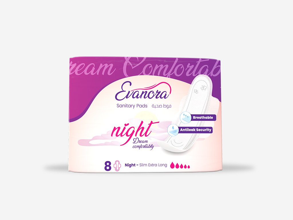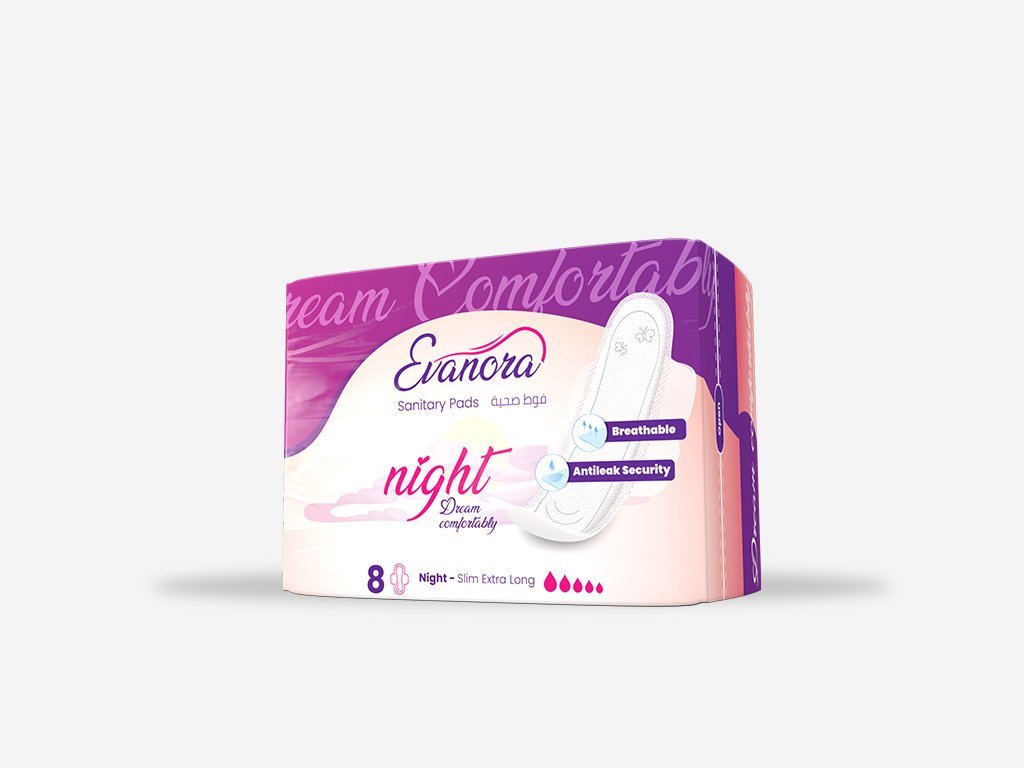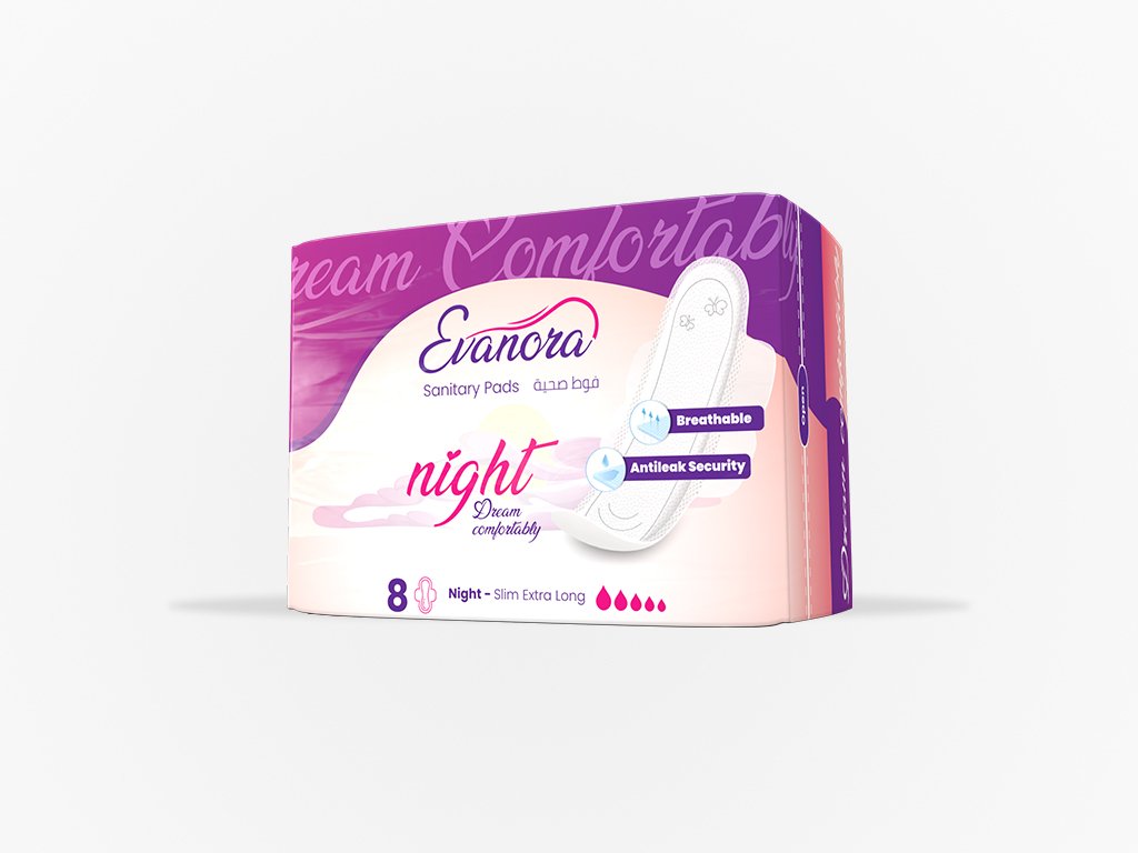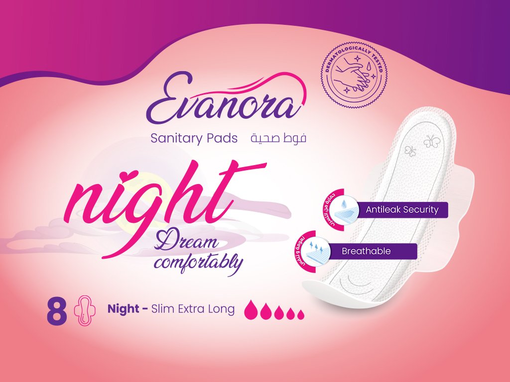 Stay protected and comfortable all night with Evanora Night. Designed with a thin, extra-long shape and soft-touch wings, it offers breathable comfort, anti-leak security, and freedom of movement. Perfect for peaceful, uninterrupted sleep. Size: 8 pads.