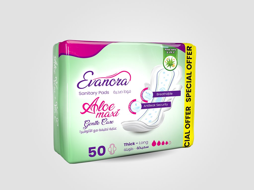 Evanora Aloe-Maxi sanitary pads offer ultimate comfort and reliable protection with a thick, long design that ensures full coverage. Infused with Aloe Vera and Vitamin E, they provide a soothing effect for sensitive skin. With breathable material, anti-leak security, soft-touch wings, and a secured locking system, they deliver freedom of movement and peace of mind—day or night. Each pack contains 50 pads for long-lasting care.
